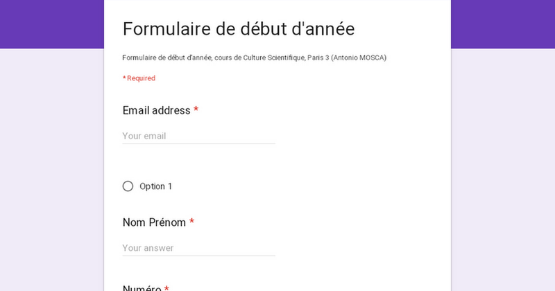 Formulaire de début d'année, cours de Culture Scientifique, Paris 3 (Antonio MOSCA)