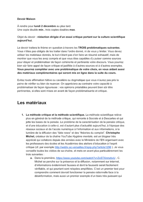 Devoir Maison À rendre pour lundi 2 décembre au plus tard. Une copie double min., trois copies doubles max. Objet du devoir : rédaction dirigée d’un essai critique portant sur la culture scientifique aujourd’hui. Le devoir traitera le thème en question à travers les TROIS problématiques suiva...